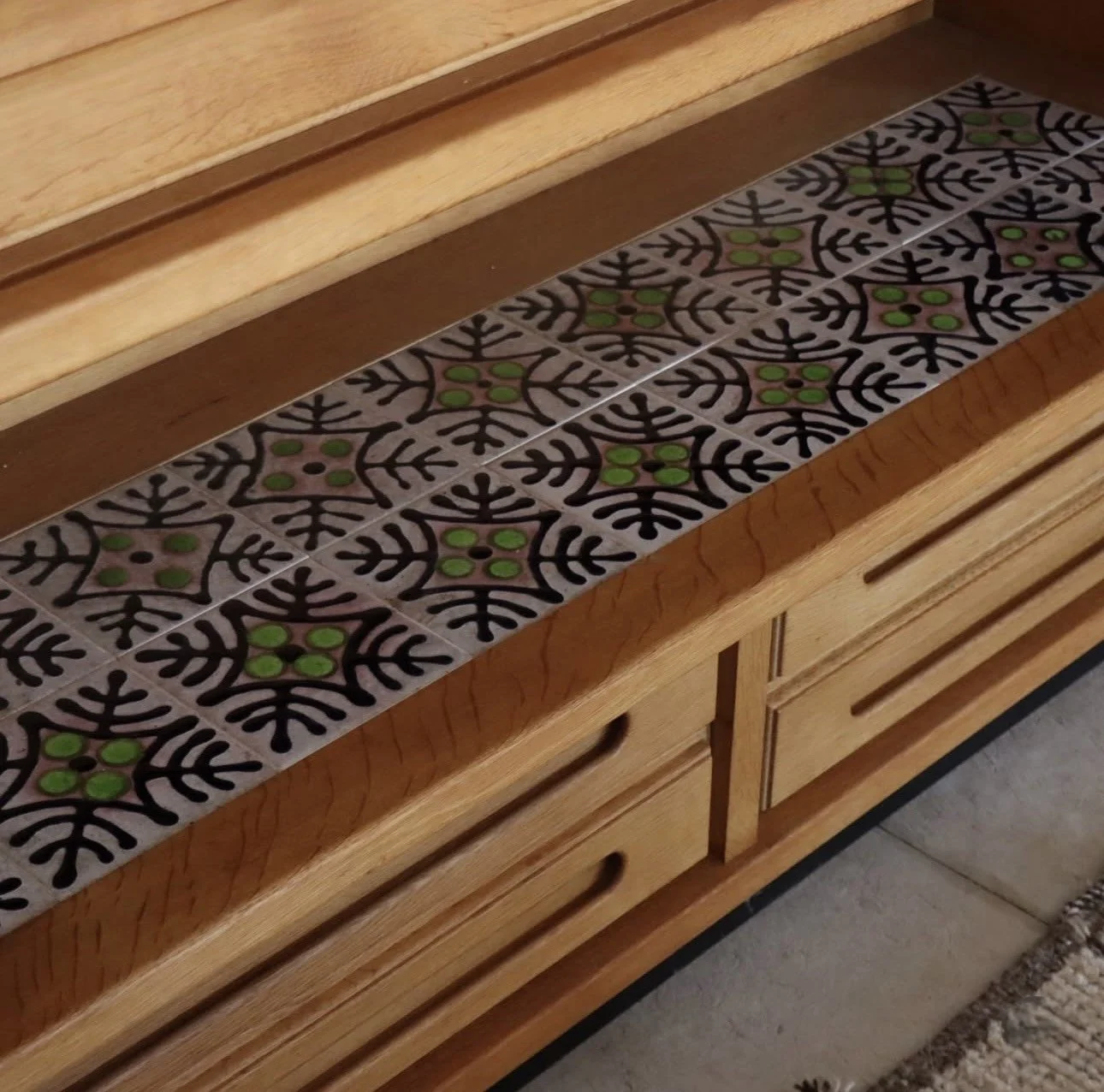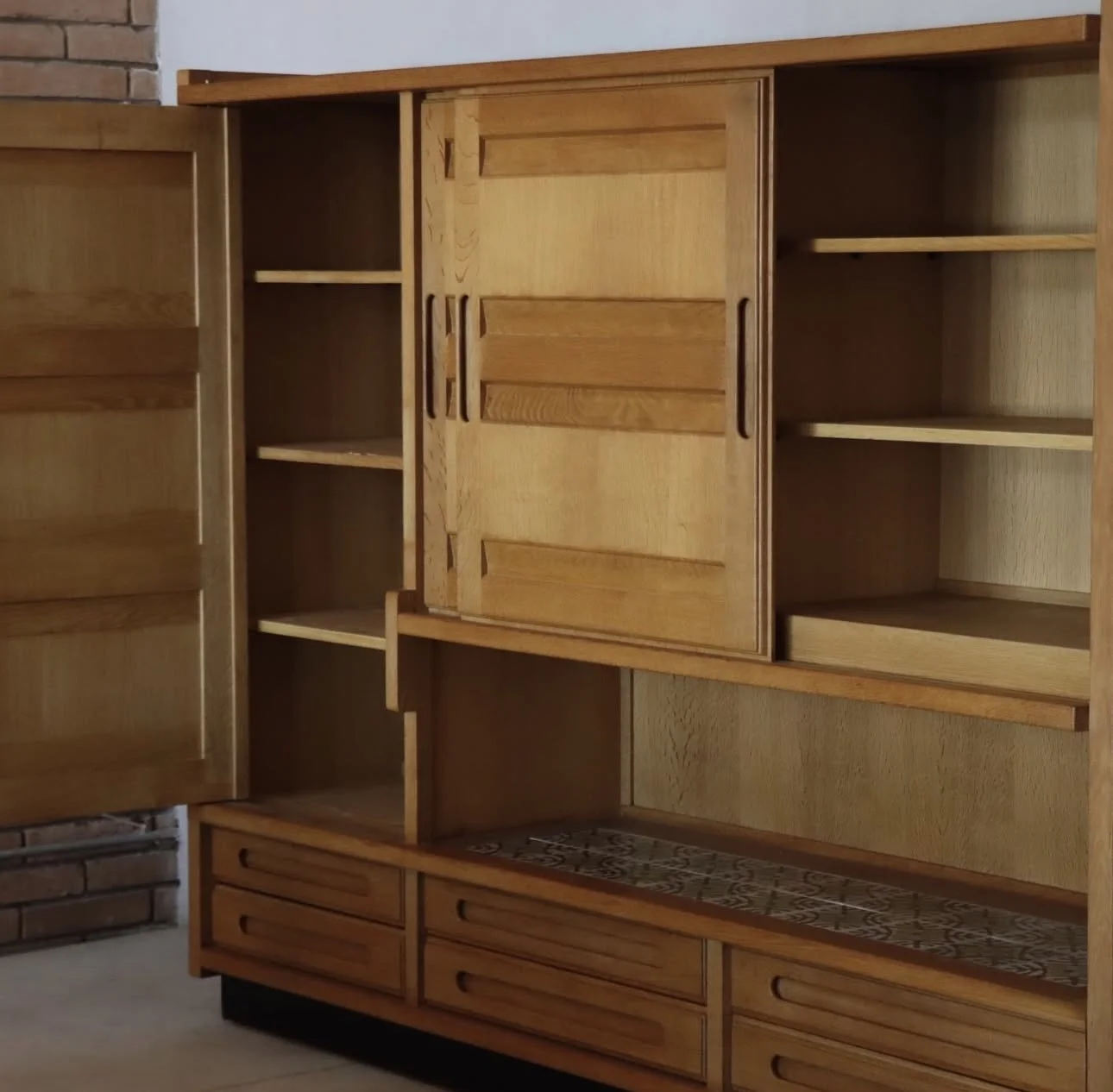 This example features a beautifully grained solid oak frame, a full suite of drawers + cupboards + open shelving, and a tiled surface detail credited to ceramicist Boleslaw Danikowski.