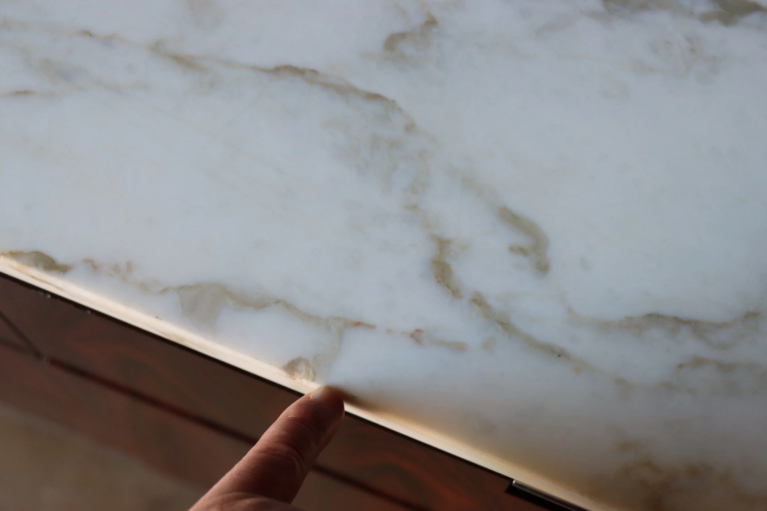 Plenty of drawer storage with recessed pulls and full-length bookmatched veneer that shows off a wild cathedral grain pattern. Such a beautiful example.