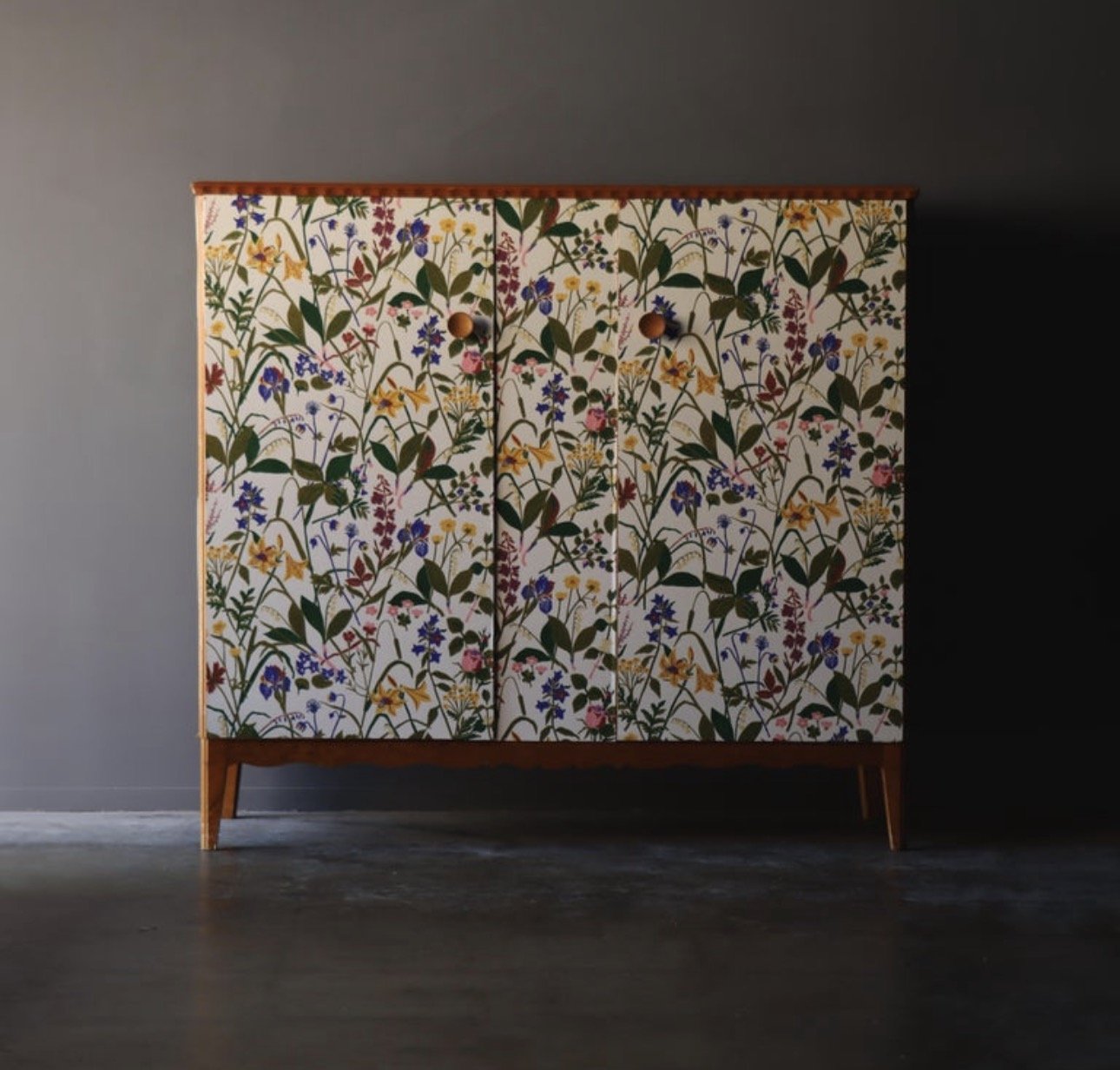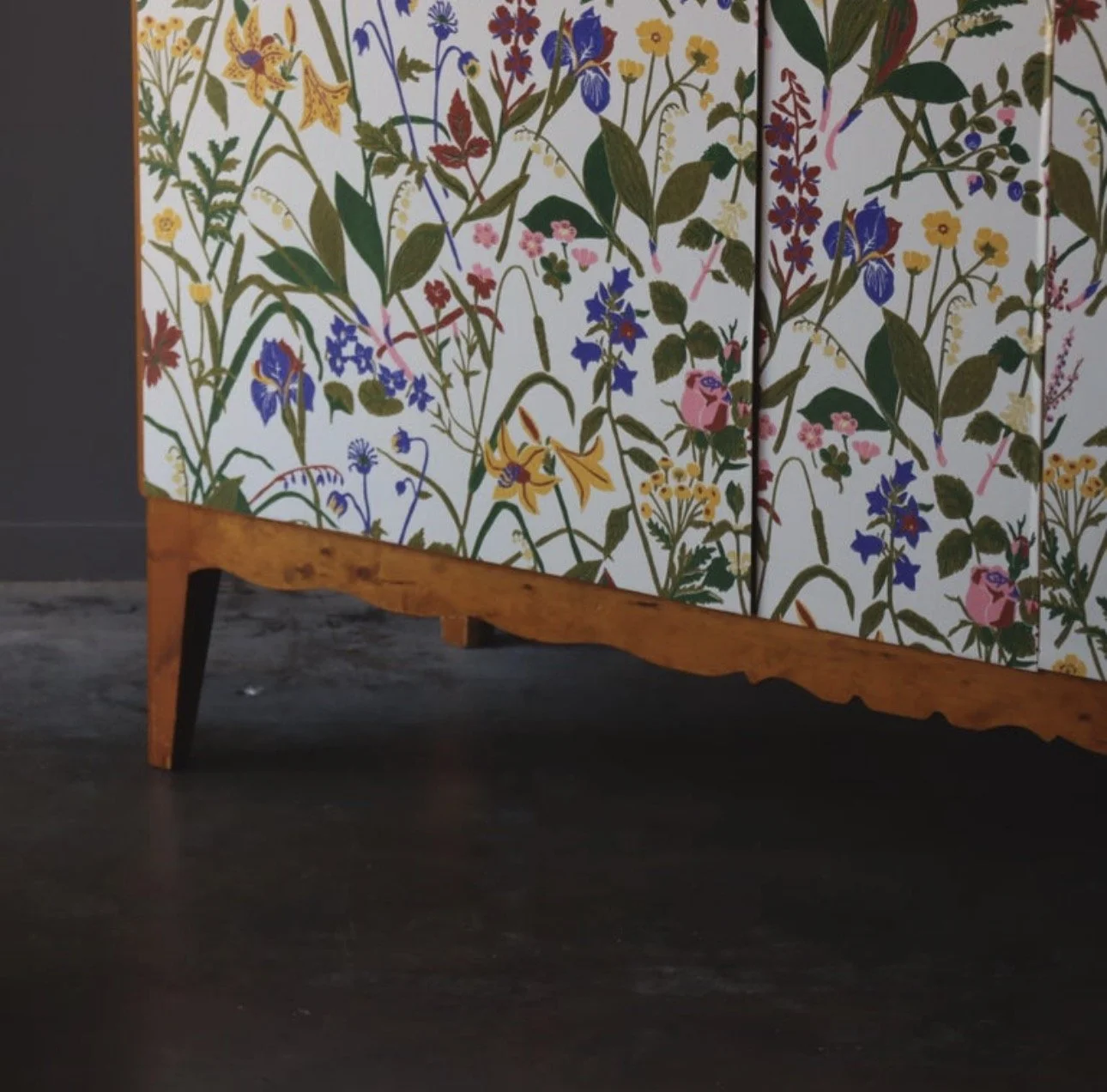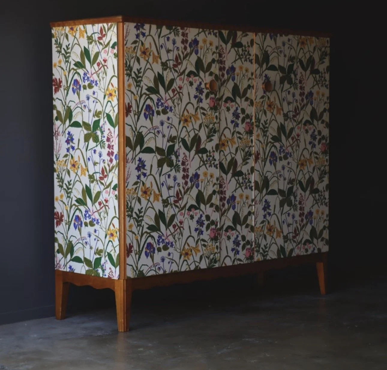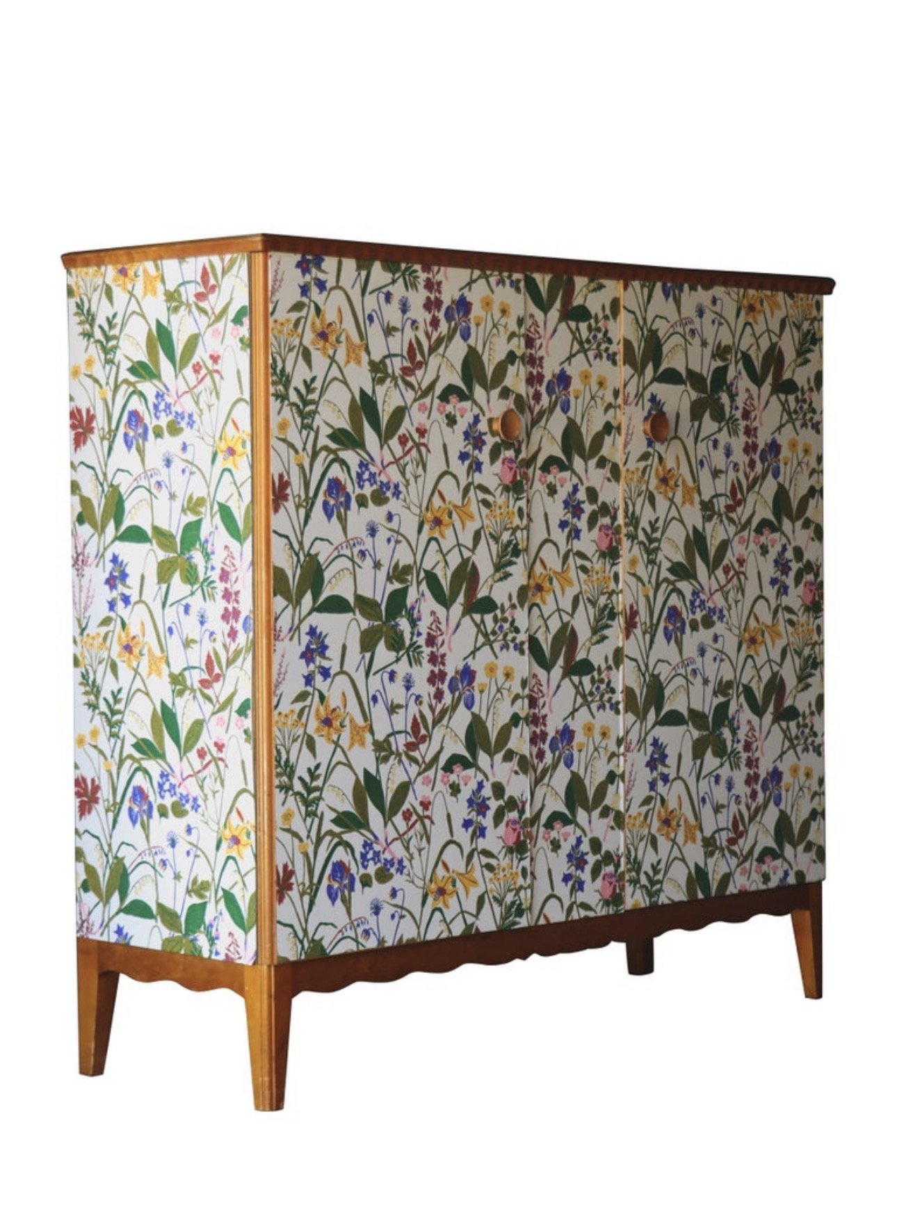 Vintage Swedish cabinet, after Josef Frank. Wildflower front with a grounded frame. The loose botanical motif echoes the Svenskt Tenn aesthetic with a nice balance of movement. Solid wood case in a warm beech tone, scalloped apron, and top trim with a fully shelved interior.