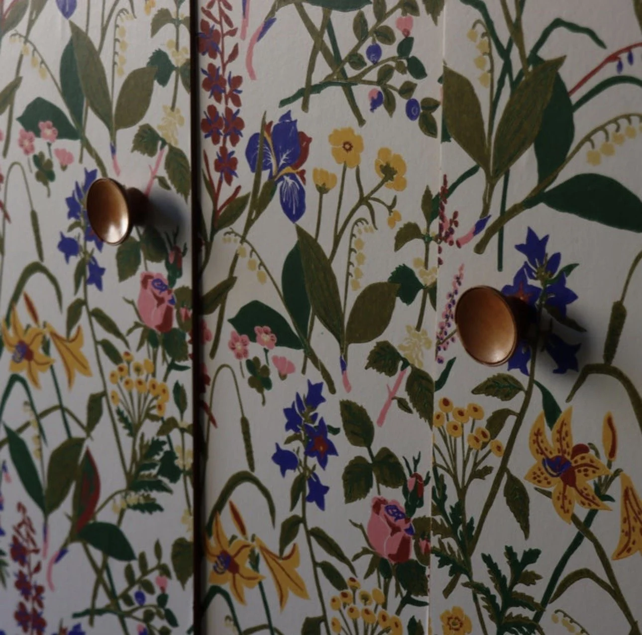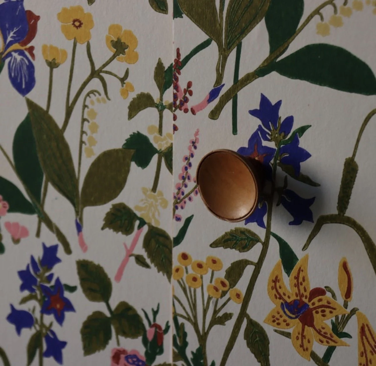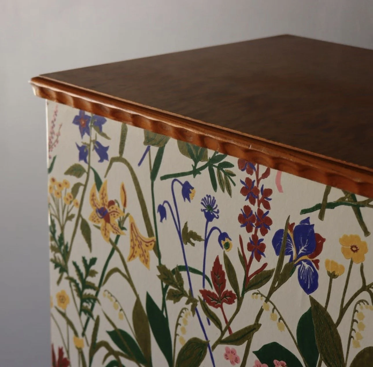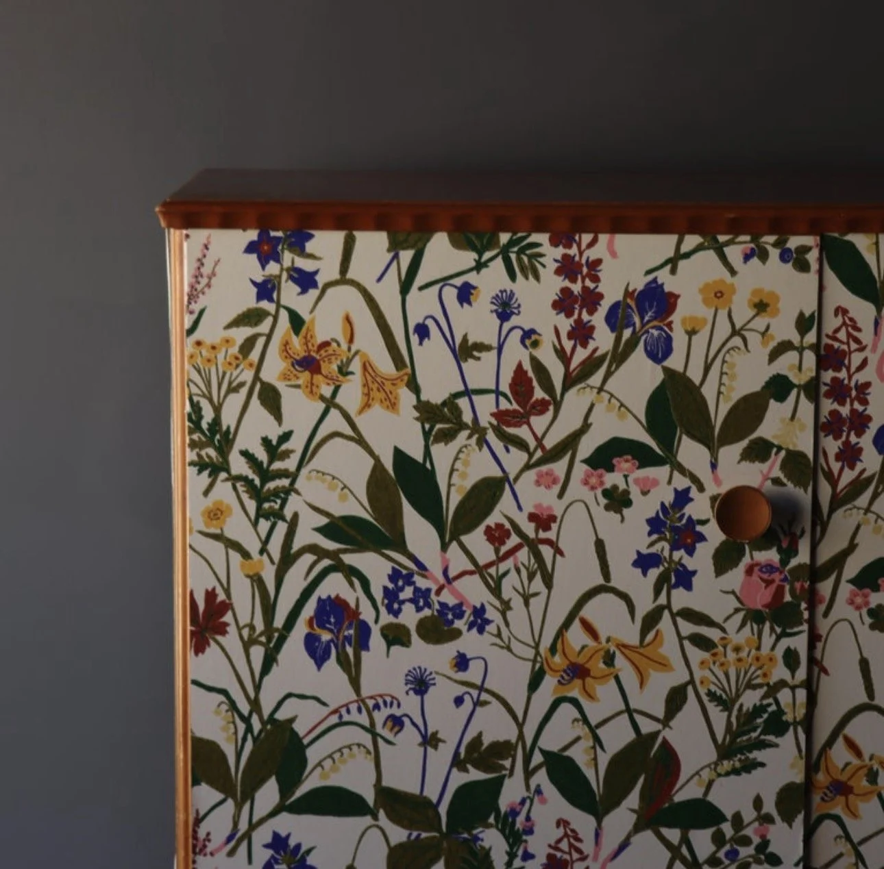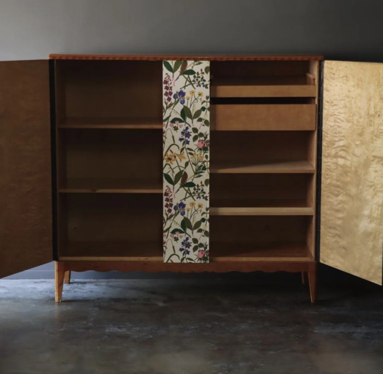 Vintage Swedish cabinet, after Josef Frank. Wildflower front with a grounded frame. The loose botanical motif echoes the Svenskt Tenn aesthetic with a nice balance of movement. Solid wood case in a warm beech tone, scalloped apron, and top trim with a fully shelved interior.