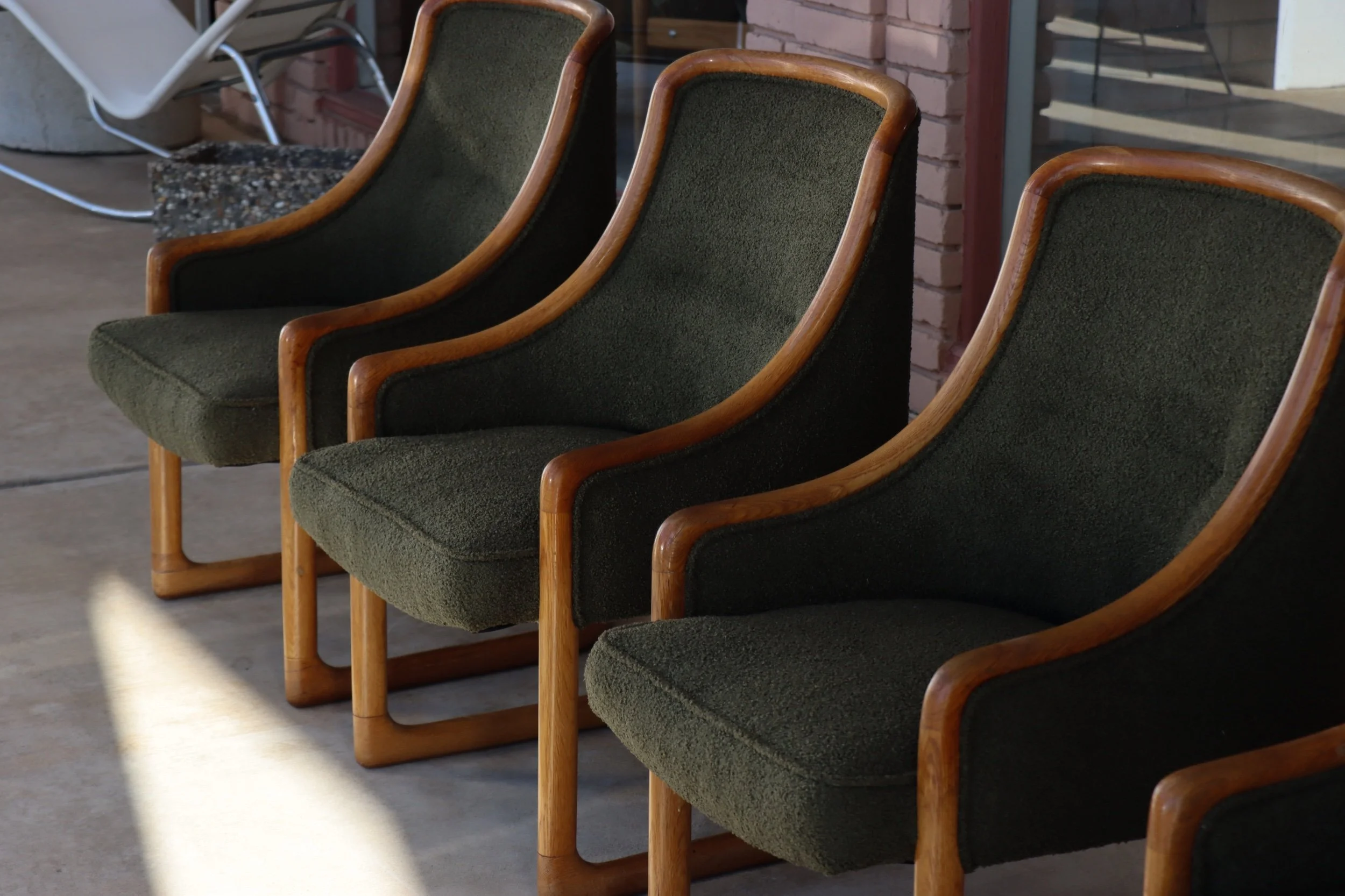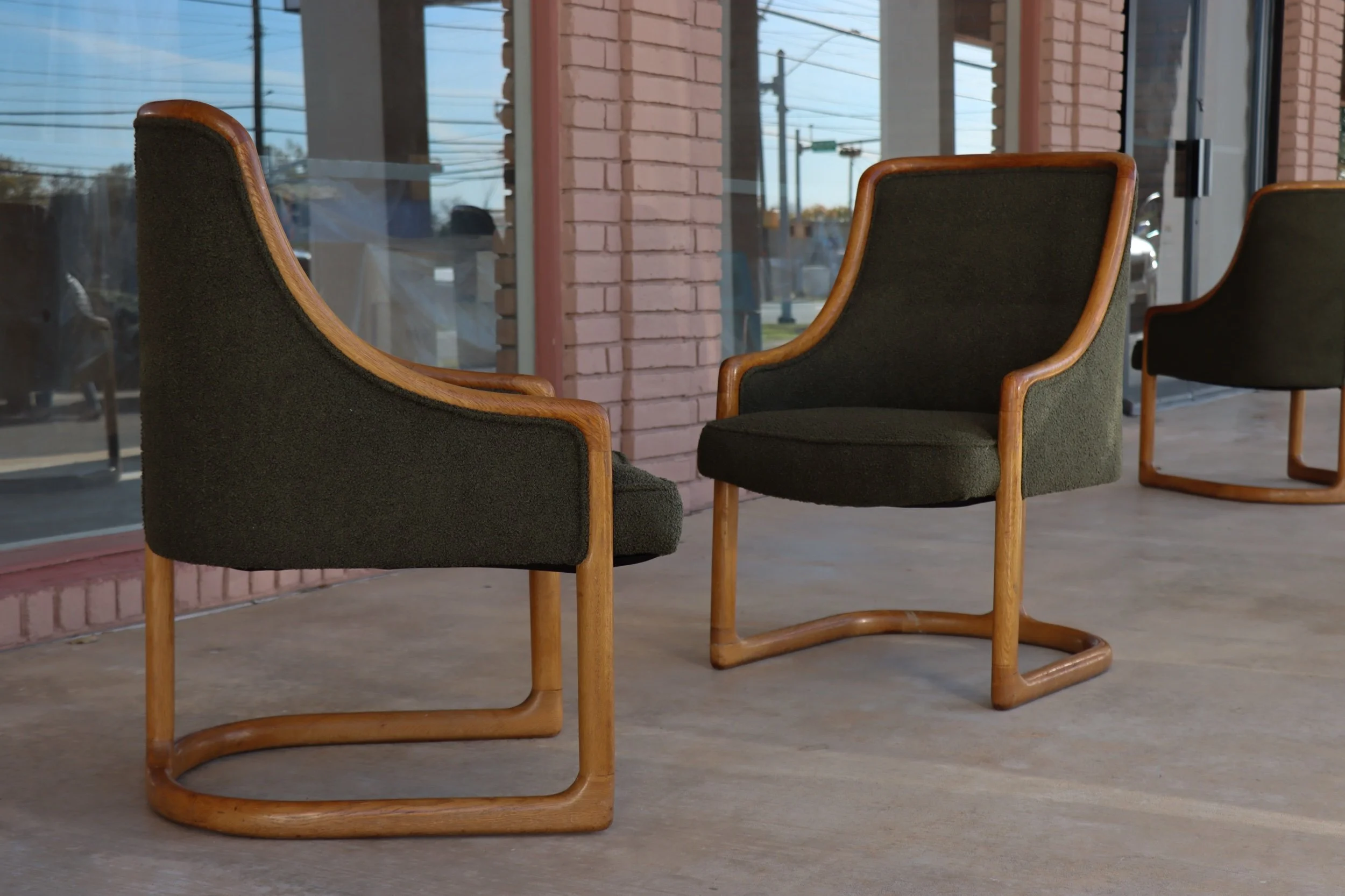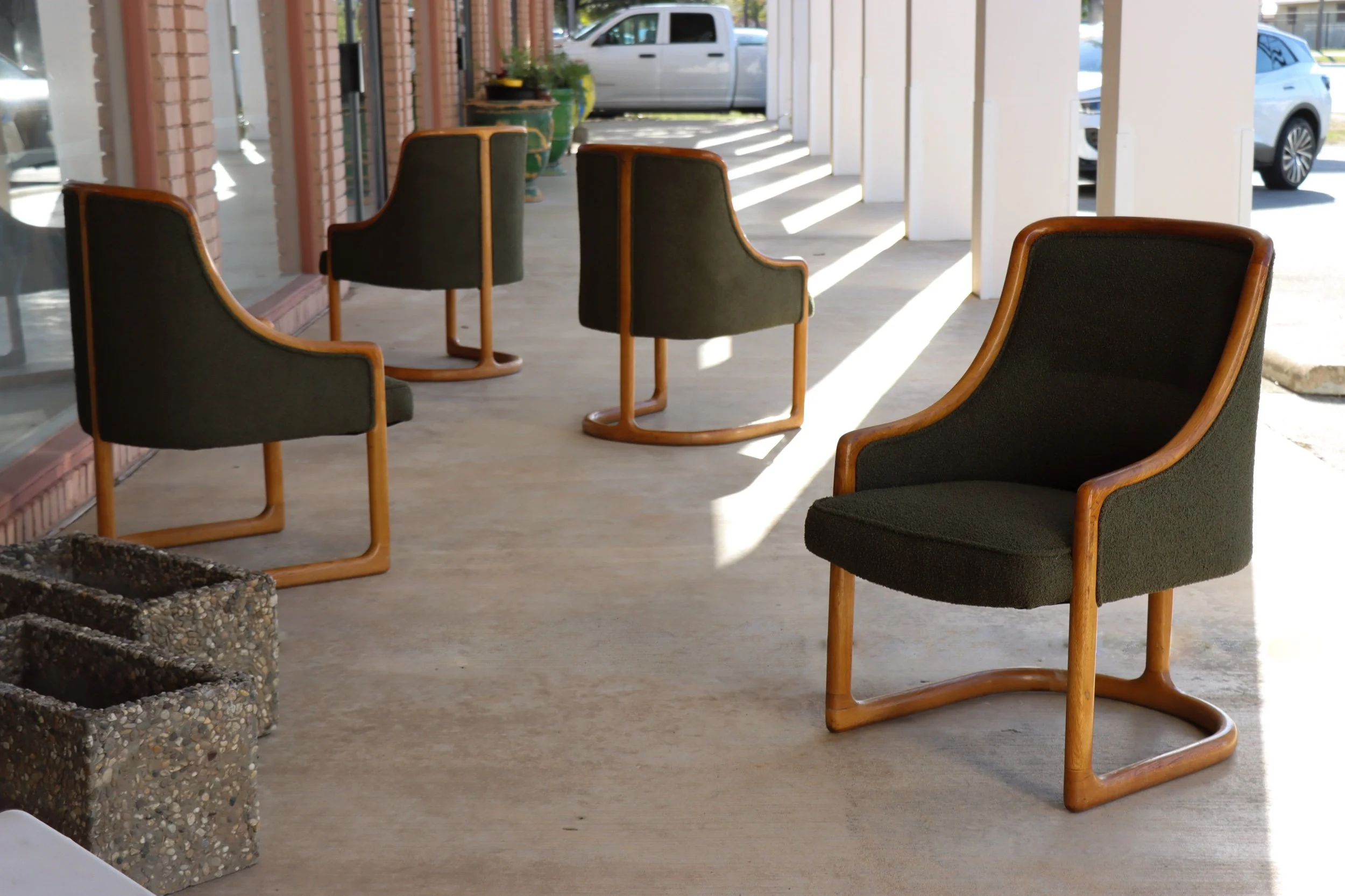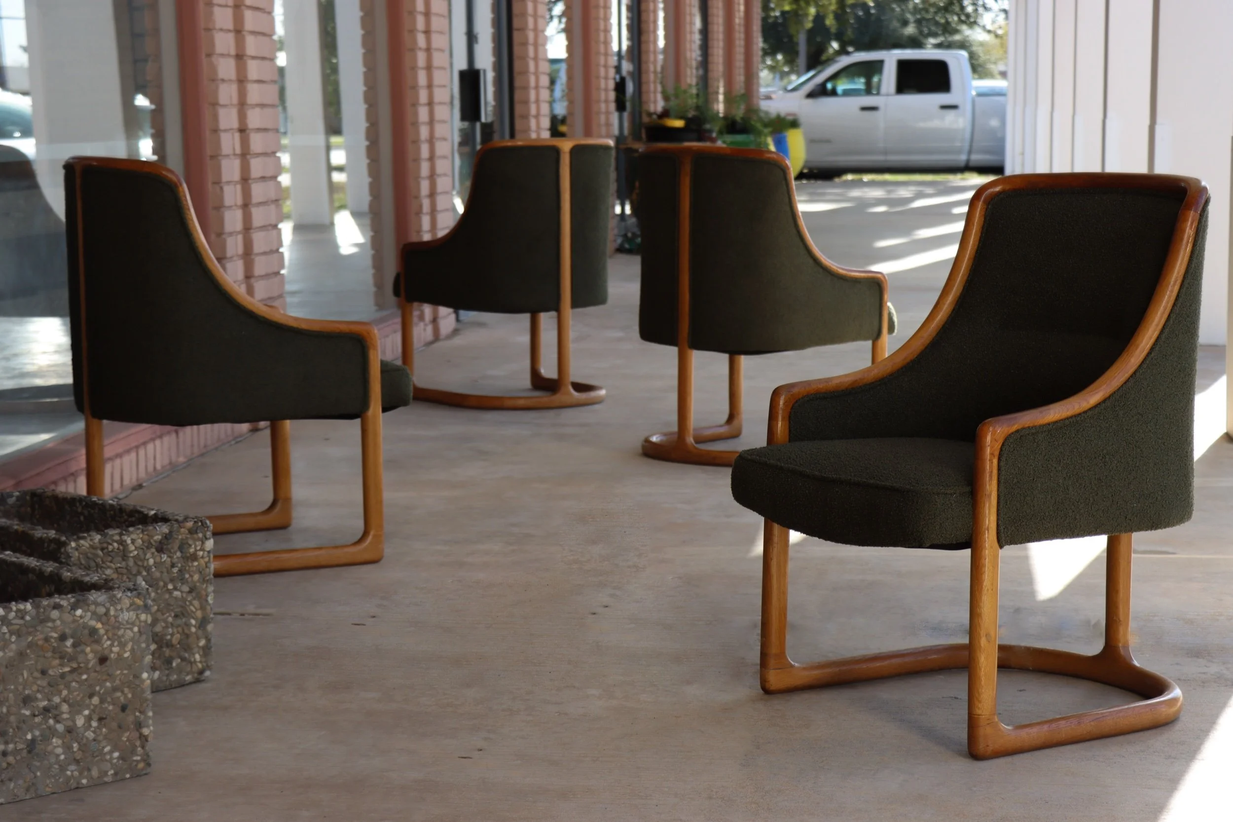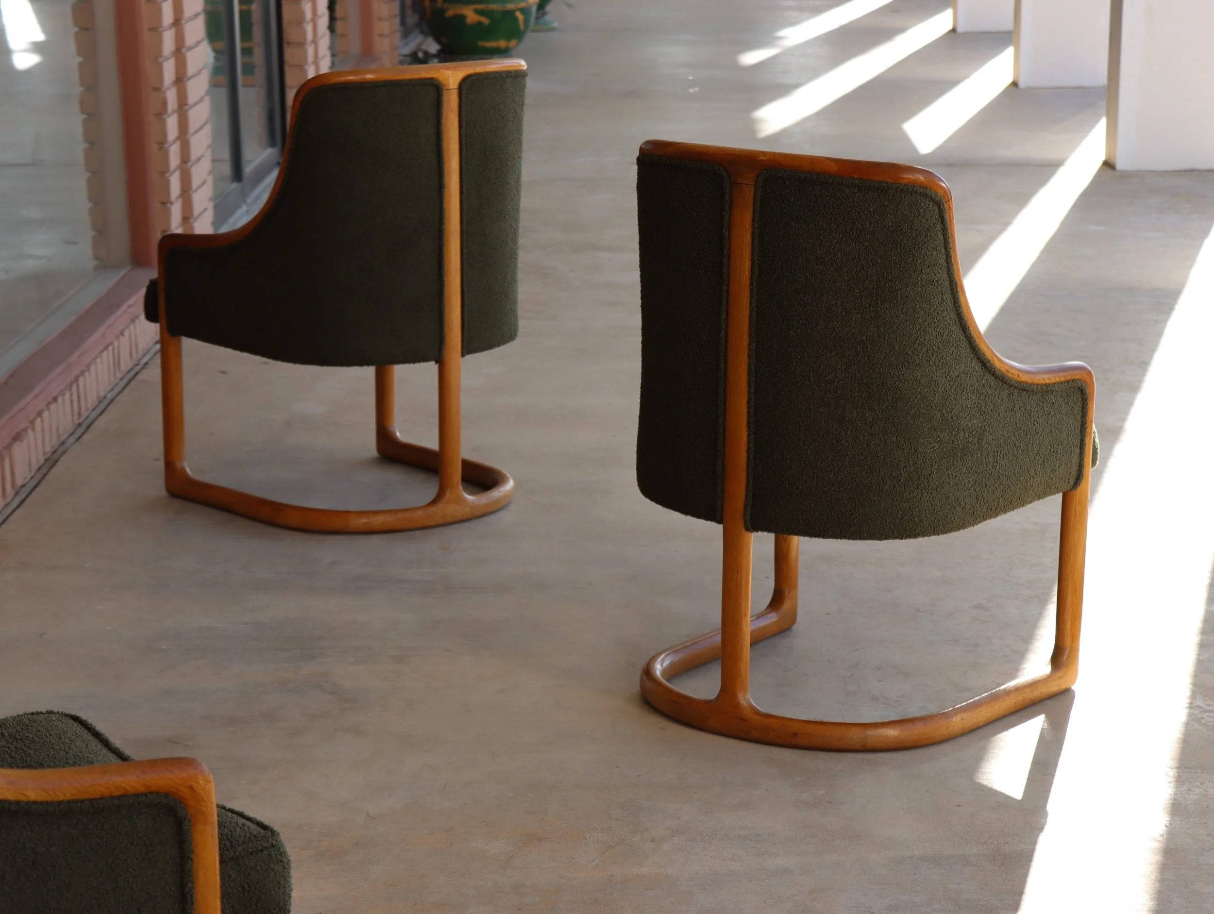 These sculptural chairs reflect Kagan's mastery of fluid form and structure, with bentwood frames that flow seamlessly from arm to leg. The design feels architectural while remaining soft in presence.
